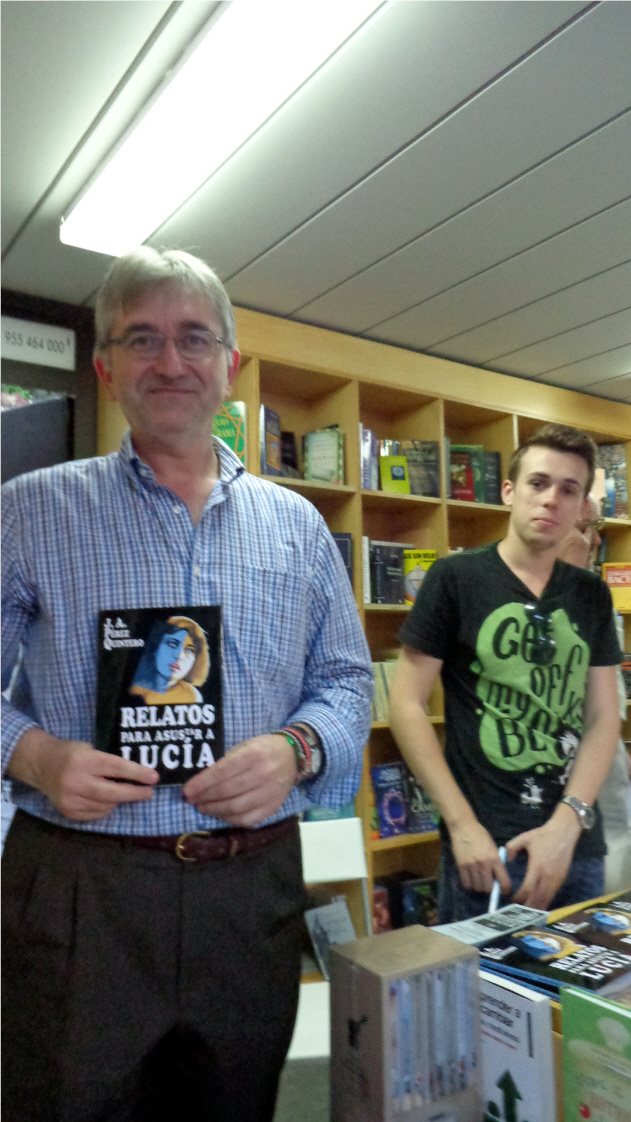 También en la Feria del Libro compré el libro «Relatos para asustar a Lucía» de José Ángel Pérez Quintero y me puso esto junto con su autógrafo: «Para Paty, espero que la lectura te haga sentir mucho miedo, una de las emociones que nos hacen sentir más vivos». Igual me firmó el libro el ilustrador Alejandro García Escámez, muy jovencito por cierto quien me invitó a su blog: