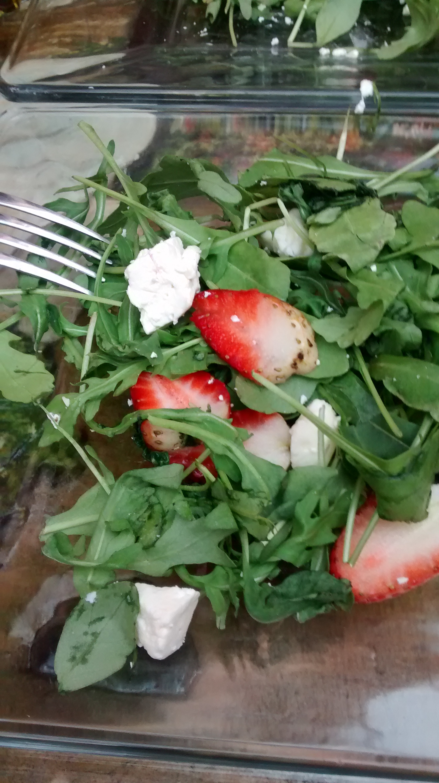 Iniciamos con una ensalada de arúgula con fresas y queso de cabra de la región. Fresas frescas de Irapuato.