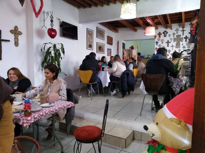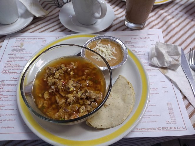 Resulta una delicia desayunar en Pan Bendito, en la ciudad de Victoria de Durango, dónde puedes elegir en un extenso menú de combinaciones de desayuno con nombres curiosos: San Blas que venía con huevo revuelto, frijoles fritos, chicharrón en salsa verde y dos enfrijoladas. Del Monaguillo que venía con chilaquiles verdes, huevo revuelto, frijoles fritos y queso. Otra delicia fue la machaca en caldo que consiste en la carne seca frita con huevo y bañado en caldo de res (en la foto).
