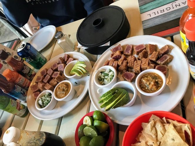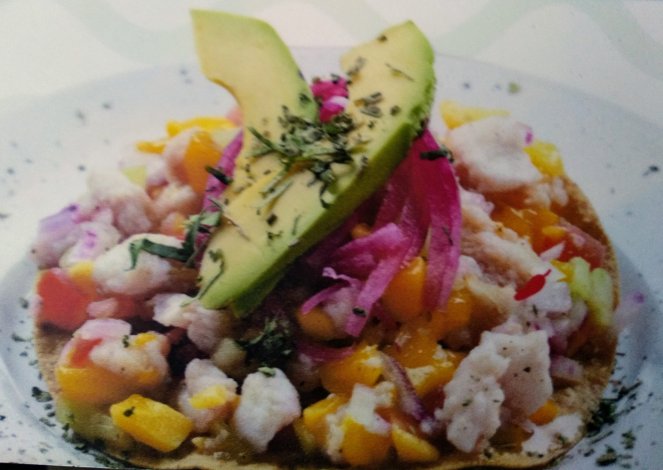 Pedí una tostada tropical. La tostada es una tortilla de maíz frita muy dorada, cubierta de ceviche de pescado con cebolla, jitomate y mango.