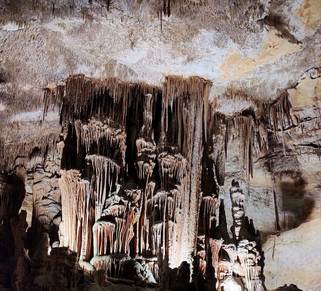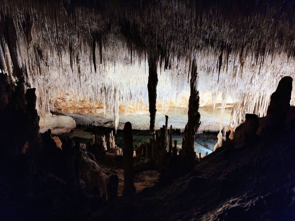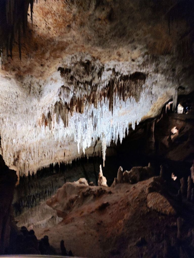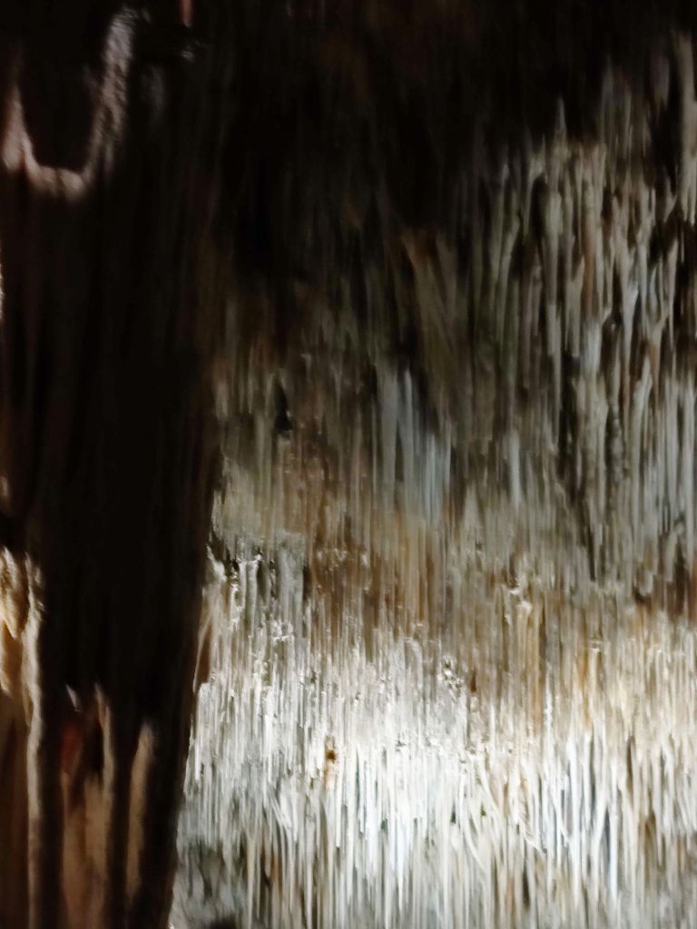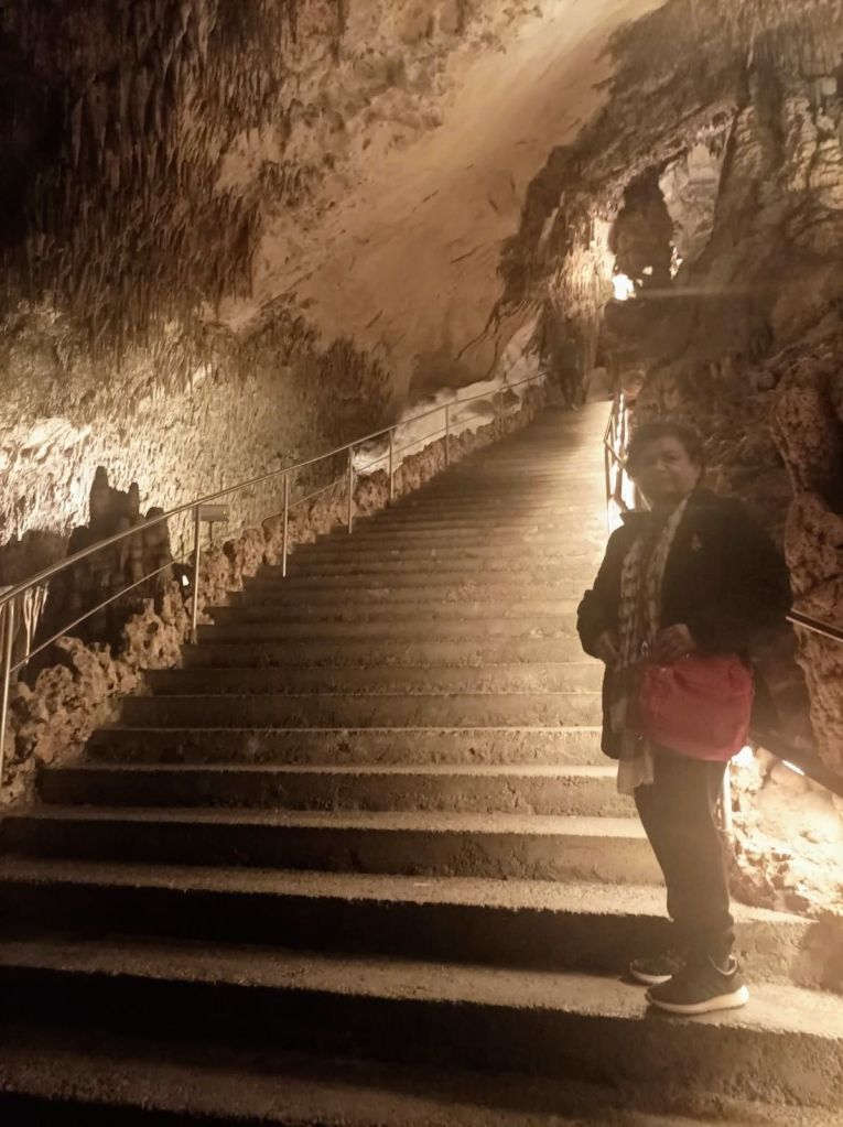 La cueva está adaptada para ser visitada, hay escaleras, pasamanos y está iluminada para mostrar el enorme número de estalactitas y estalagmitas de todos los tamaños y algunas ya unidas y además siguen creciendo porque la humedad interior no para. El piso es resbaladizo y en algunos pasos recibimos gotas en la ropa.