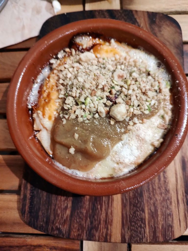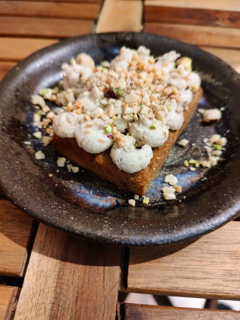 Y llegamos a los postres y pedimos «esta no es una tarta de queso» y se llama así porque es queso feta, miel con especias y avellanas. Luego seguimos con un brownie de tahini, nueces y pistaches.