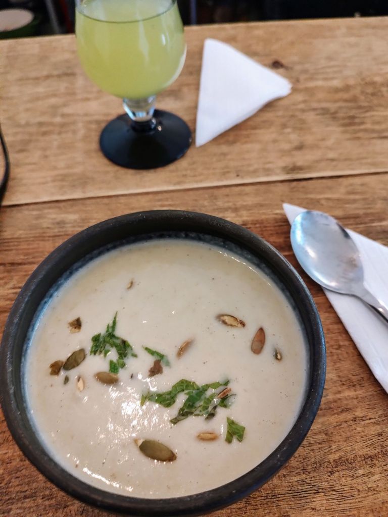 Entrada sopa de coliflor decorada con hojitas de menta y semillas de calabaza. Cómo es comida vegetariana no lleva leche ni crema, sino una crema hecha en casa de nuez de la india.