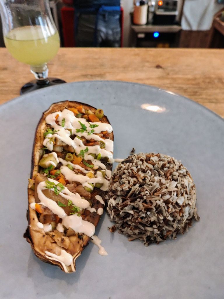 Luego, berenjena rellena de verduras guisadas y arroz salvaje.