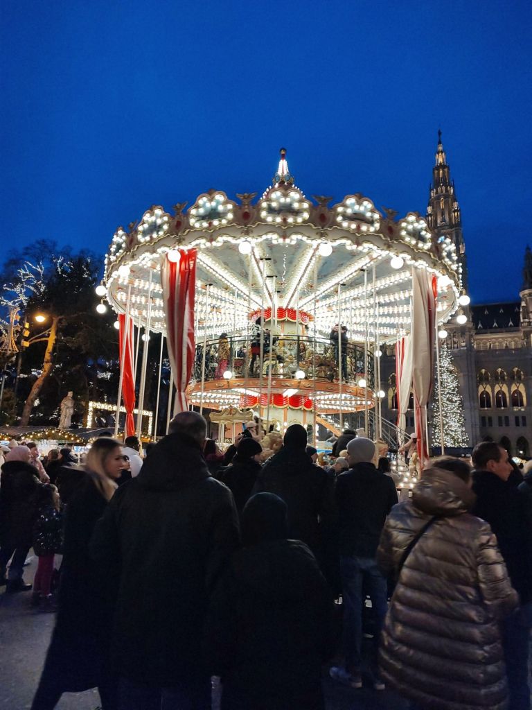 En el lugar convivían juegos mecánicos para niños, puestos de dulces, churros, pero lo que más me emocionó fue el vino caliente estilo Alemania que nos sirvieron en una taza de cerámica que decía «I ❤️ Viena».