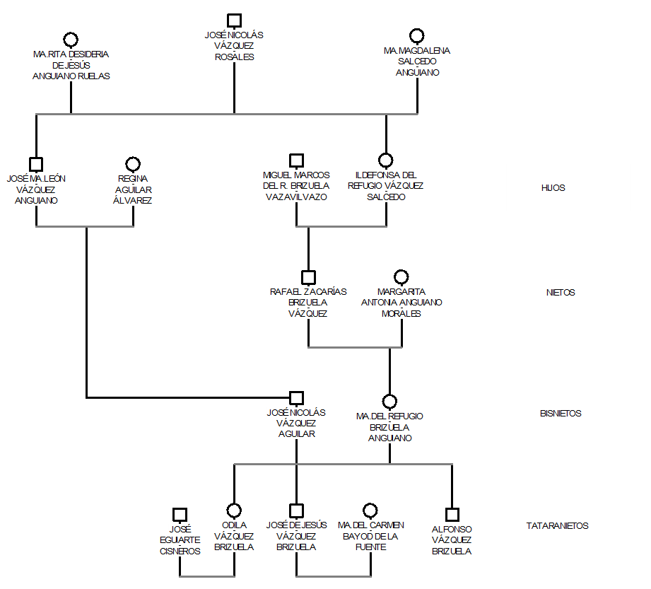 Tenemos un caso de varios, José Nicolás Vázquez Aguilar nieto de José Nicolás Vázquez Rosales y de su segunda esposa María Rita Desideria de Jesús Anguiano Ruelas, hijo de José María León Vázquez Anguiano y de Regina Aguilar Álvarez, quien contrajo matrimonio con María del Refugio Brizuela Anguiano.